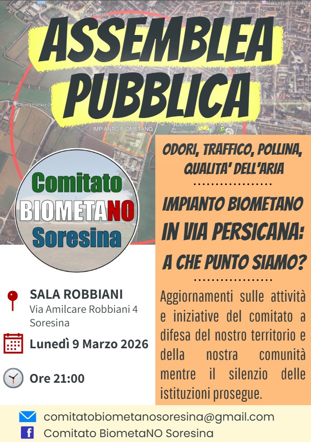 Lunedì 9 marzo, alle ore 21.00, il Comitato BiometaNO Soresina organizza un’assemblea pubblica presso la Sala Robbiani, a Soresina.