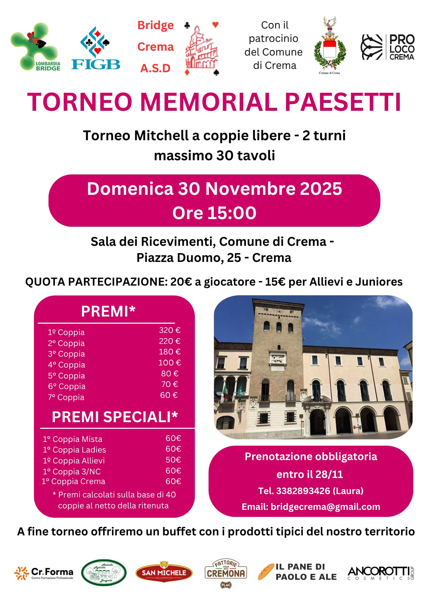 Domenica 30 novembre si terrà il torneo Memorial Paesetti, consolidato evento annuale del circolo di Crema per ricordare Mario Paesetti, per anni presidente dell’Associazione alla quale si è dedicato con grande passione sportiva. Avrà luogo nella sala dei ricevimenti del Comune di Crema, con il patrocinio dell’Amministrazione comunale e della Pro Loco.
