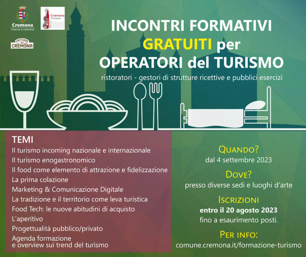 Il Comune di Cremona, Settore Cultura e Turismo, in accordo con la Camera di Commercio, organizza un ciclo di dieci incontri formativi gratuiti, grazie al sostegno di Fattorie Cremona, rivolto agli operatori del settore del turismo. A seguito di alcune valutazioni sorte durante gli incontri con operatori locali nell’ambito dell’Osservatorio Turismo coordinato dall’Università Cattolica e […]