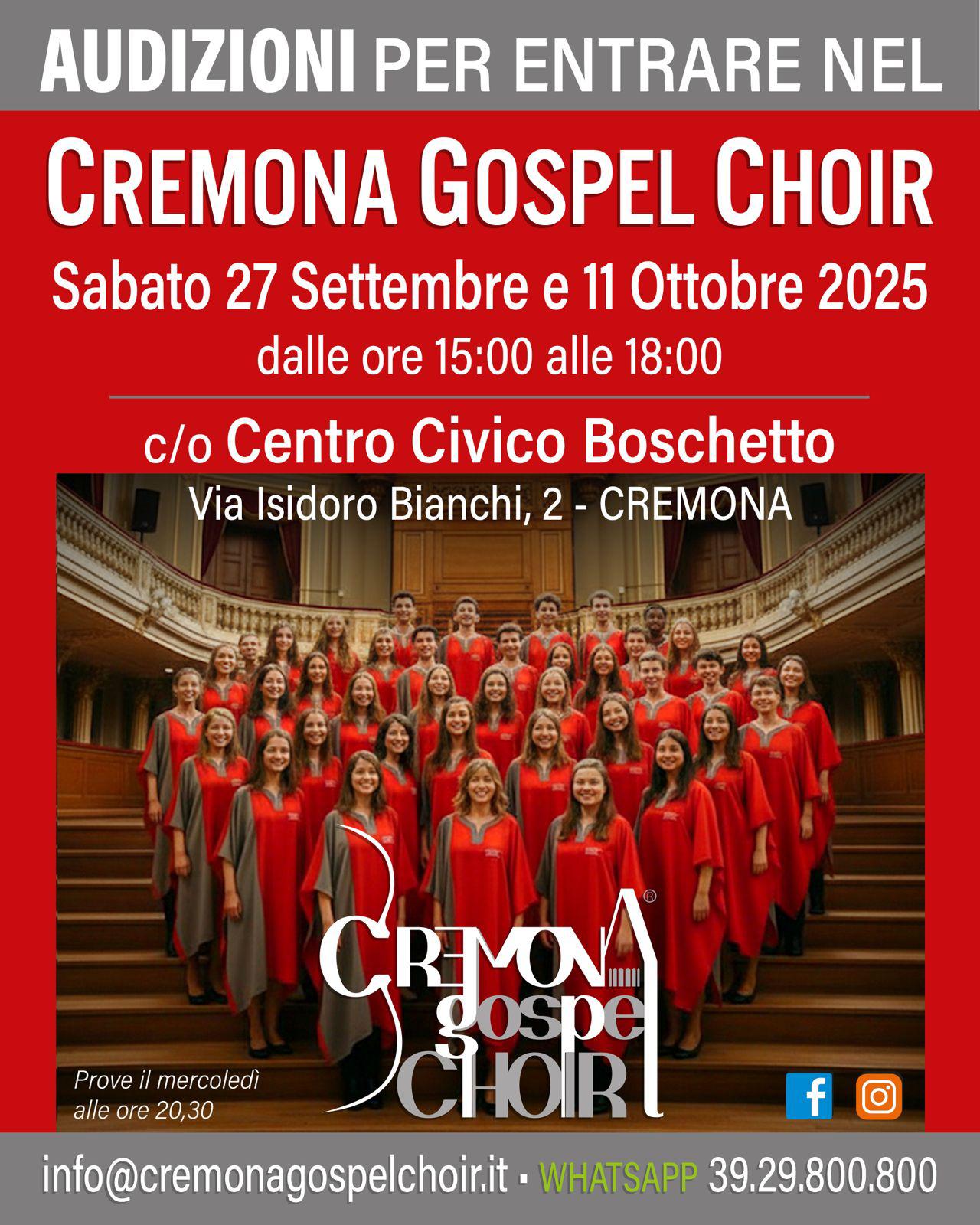 Per iscriversi, chiedere informazioni e contattare l’organizzazione del coro basta mandare una mail a info@cremonagospelchoir.it oppure scrivere un messaggio whatsapp al numero 39.29.800.800.