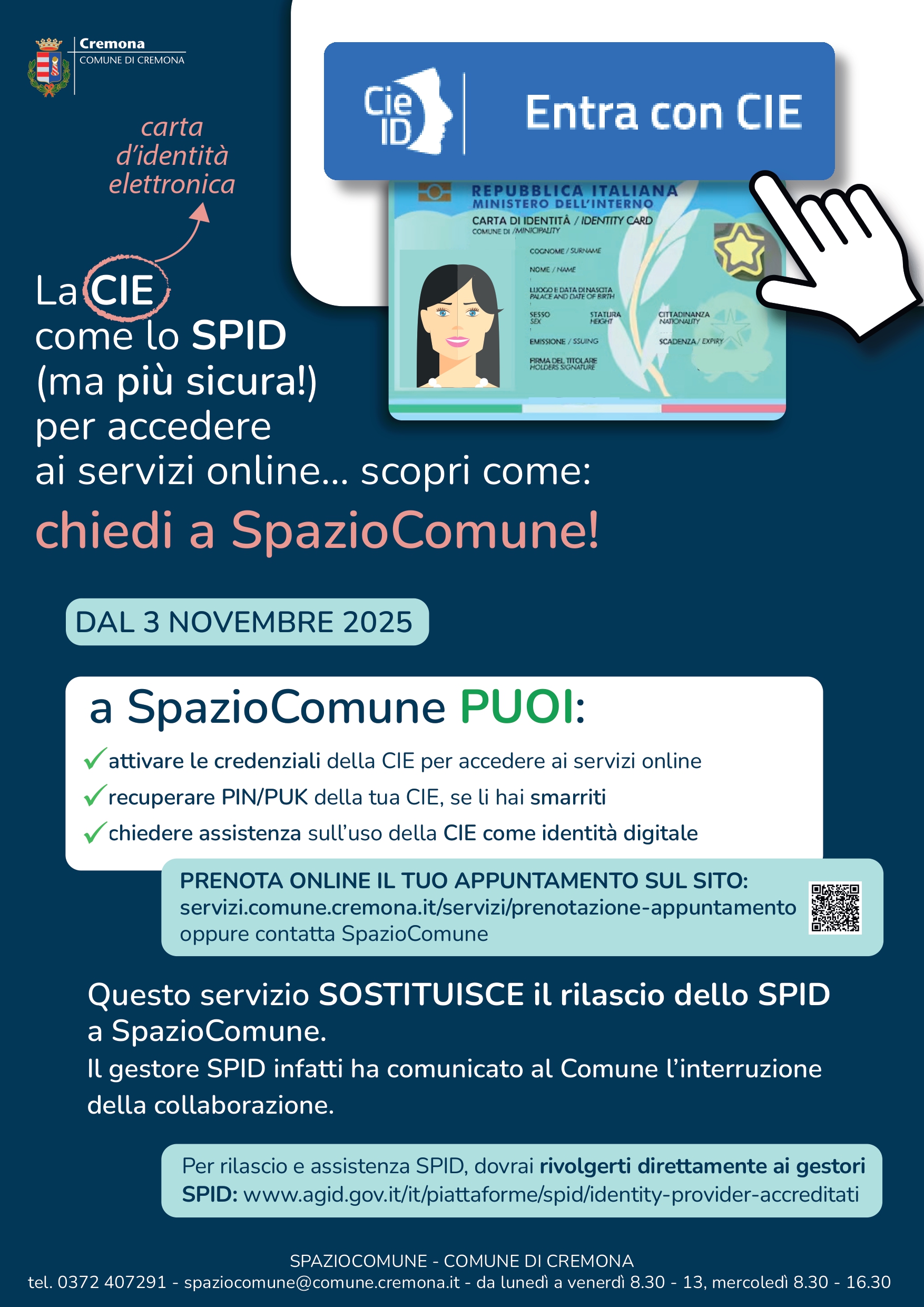 L’Ufficio Anagrafe sarà rafforzato con l’apertura di uno sportello dedicato al solo rilascio delle CIE in sostituzione delle carte di identità cartacee e delle vecchie CIE con accesso su prenotazione. Per garantire un’efficace diffusione dell’uso della CIE, anche come forma di identità digitale, dal 3 novembre 2025, al posto del servizio SPID, a SpazioComune (piazza Stradivari, 7), in collaborazione con i Servizi Demografici, sarà attivato uno sportello telefonico e fisico di prenotazione online degli appuntamenti all’Ufficio Anagrafe per la sostituzione delle carte d’identità cartacee e delle vecchie CIE e per il rilascio, in caso di smarrimento, del codice PIN e PUK associato alle CIE emesse dopo il 3 ottobre 2016 e tutt’ora in corso di validità. L’utilizzo del PIN associato alla CIE si renderà necessario per compensare il fatto che lo SPID cesserà di essere valido nel giro di qualche anno.