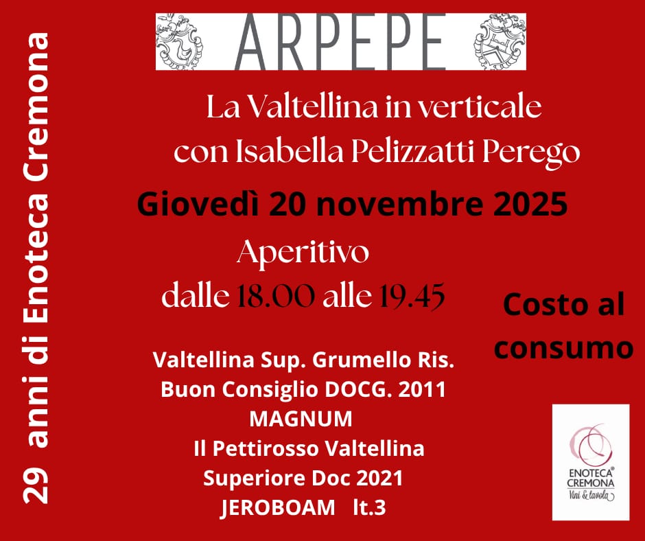 Enoteca Cremona celebra 29 anni di attività il 20 novembre con i vini della Valtellina