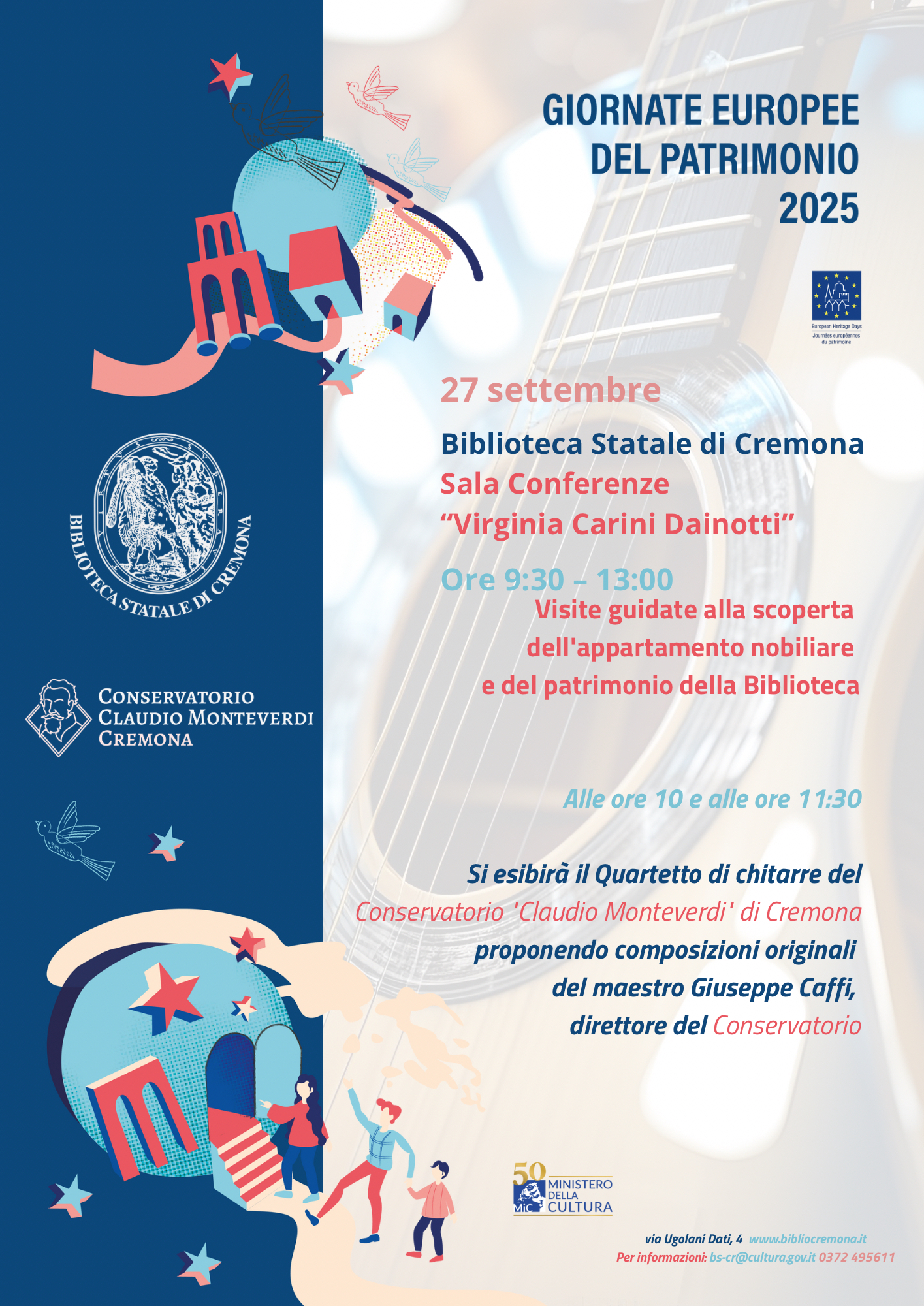 All’interno del programma delle Giornate Europee del Patrimonio (European Heritage Days), la più estesa e partecipata manifestazione culturale d’Europa, promossa dal Consiglio d’Europa e dalla Commissione Europea e coordinata per l’Italia dal Ministero della Cultura, la Biblioteca Statale di Cremona propone visite guidate alla scoperta dell’appartamento nobiliare e del patrimonio della Biblioteca.