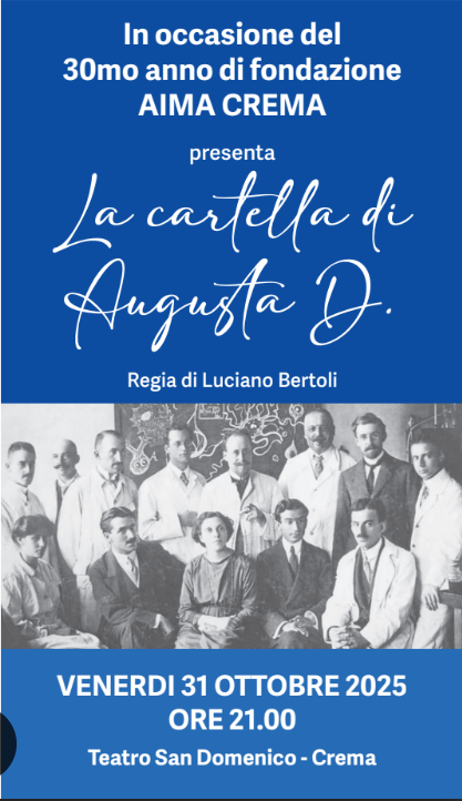Si sa che la storia non si fa con i “se” e con i “ma”. Neppure la storia della medicina. Eppure la rappresentazione teatrale a cui abbiamo assistito venerdì 31 ottobre al San Domenico di Crema induce a porsi almeno alcune domande. La scena è ambientata ai primi del Novecento, nella “Clinica per dementi ed epilettici” di Francoforte sul Meno, dove il signor Deter, impiegato delle ferrovie (Andrea Manni), accompagna la moglie Augusta (Gabriella Tanfoglio) per farla visitare dal primario dottor Alzheimer. La vicenda è raccontata con grande capacità espressiva da una compagnia di attori con la regia di Luciano Bertoli, che interpreta lo stesso Alzheimer. Il motivo di tale argomento è la celebrazione del trentesimo anno dalla fondazione di AIMA Crema (Associazione Italiana Malattia di Alzheimer). La serata cittadina è ricca di altre iniziative, compresa una frequentatissima lezione del professor Vincenzo Cappelli sulla storia di Crema e, come se non bastasse, è pure Hallowheen.
