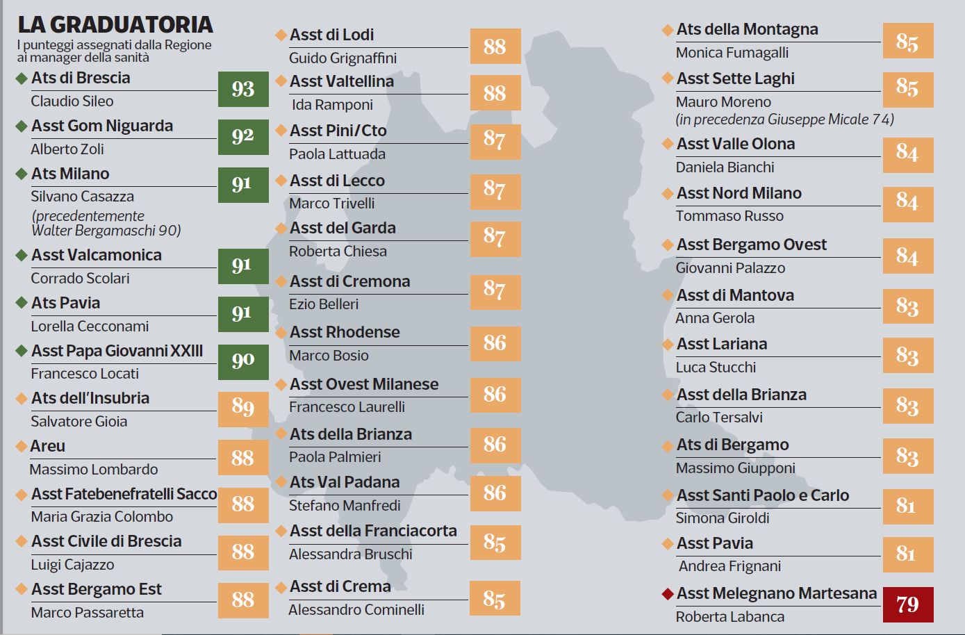 Dai voti della Regione sull’efficienza dipende il 20% dello stipendio dei direttori: tra i criteri per la valutazione l’abbattimento delle liste d’attesa e l’attivazione delle Case di comunità. Claudio Sileo, al vertice, oggi guida l’Ats Brescia, 93 punti, poco sotto di lui Alberto Zoli (Niguarda).