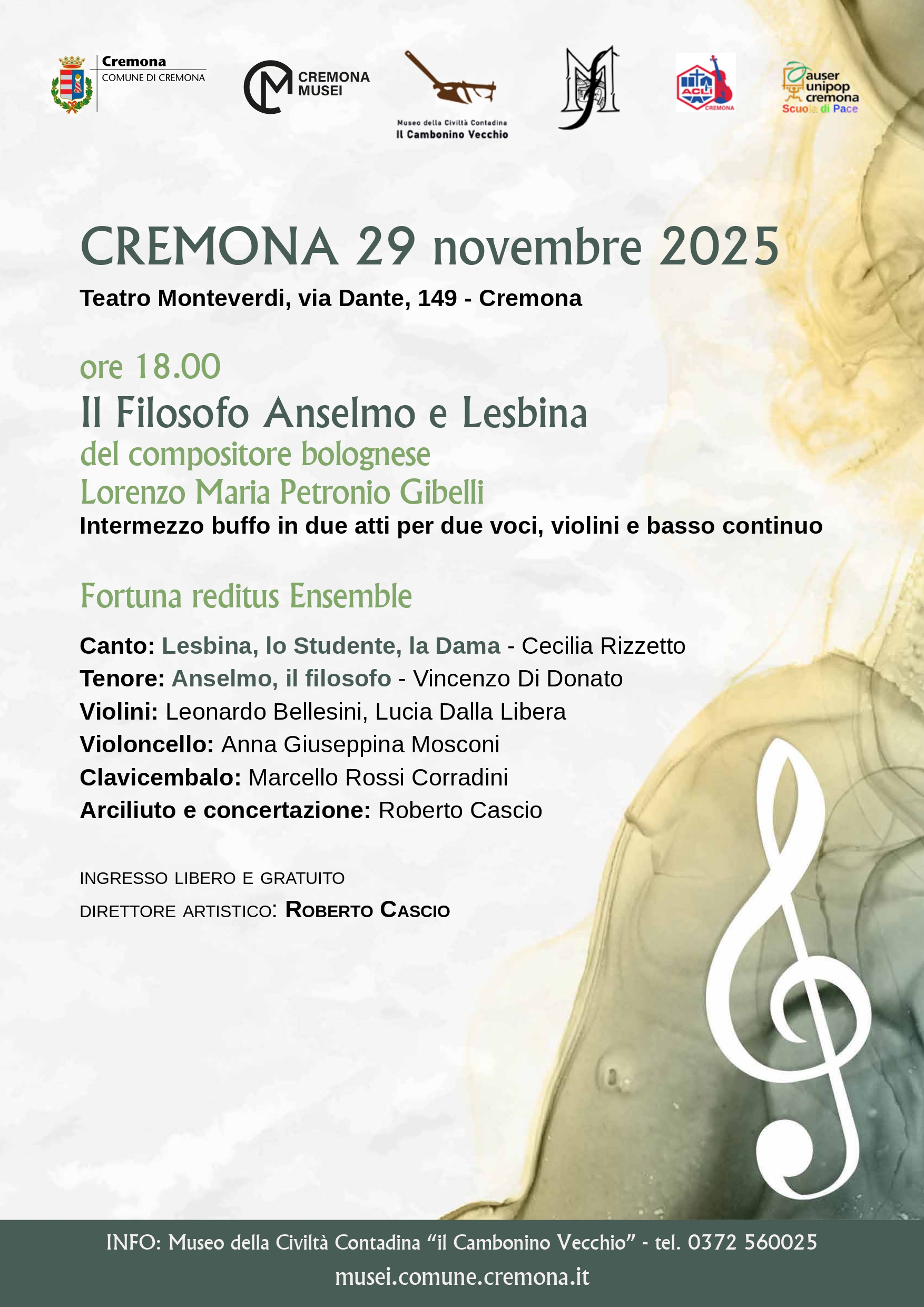 Sabato 29 novembre, alle ore 18, al Teatro Monteverdi (via Dante, 149), nuovo appuntamento della rassegna autunnale del Microfestival di Musica Antica e Teatro – organizzata dal Comune di Cremona (Museo della Civiltà Contadina “Il Cambonino Vecchio”) in collaborazione con Auser Unipop e con Acli Turismo – con la direzione artistica di Roberto Cascio.