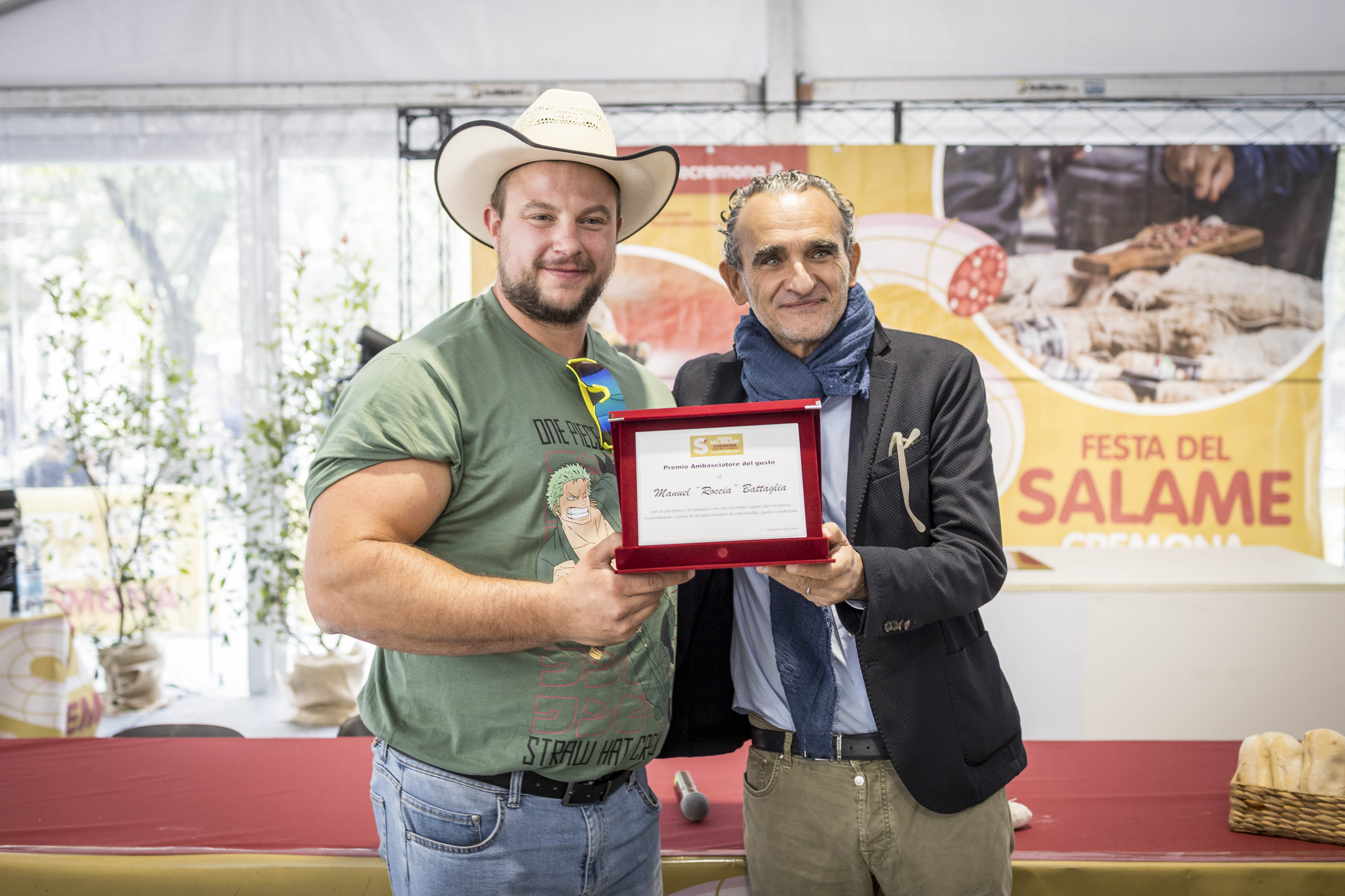 “Pane e salame credo sia la merenda di tutti: non c’è un’altra che la batta. Mi conoscono tutti per questo, e io ne sono più che fiero – commenta Manuel “Roccia” Battaglia -. Ogni giorno ne mangio almeno sette fette, preferisco quello di capra, anche se è più impegnativo da fare. Quello di Cremona, invece, è molto buono, anche se diverso da quello bresciano, ma il bello dell’Italia è proprio questo: in ogni posto c’è una lavorazione diversa, ognuno ha la sua qualità e peculiarità”. Oltre a essere un volto noto sui social, Battaglia è anche un atleta di arm wrestling (braccio di ferro), disciplina in cui proprio recentemente ha conquistato due medaglie di bronzo nella tappa di Riyadh: “Rispetto ad altri atleti, che spesso si affidano a integratori e amminoacidi, io preferisco un’alimentazione semplice, genuina, legata alla terra: pane, salame e formaggio. È anche da qui che derivano i miei risultati. Ho ottenuto numerosi riconoscimenti e mi confronto con i migliori al mondo. Ma soprattutto credo sia importante credere in ciò che si fa e scegliere alimenti autentici, agricoli, che fanno bene al corpo e allo spirito”.