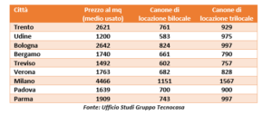 Anche a Treviso i prezzi sono in crescita. In parte l’aumento è dovuto alla nascita di nuove costruzioni in zona Fiera e Stadio e che si vendono a valori medi di 4000-5000 € al mq se con affaccio sul Sile. E’ stata creata anche una pista ciclabile e pedonale presente lungo il fiume. Anche su Treviso la presenza dell’aeroporto, la vicinanza a Venezia e la presenza di universitari fuori sede determina una buona presenza di affitti turistici.