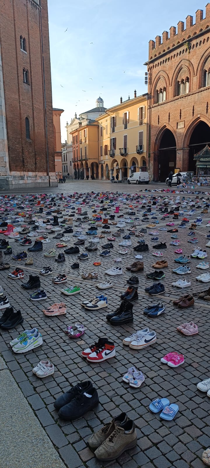 “QUANTI SONO 20.000 BAMBINI”, installazione collettiva di scarpette in piazza del Comune.